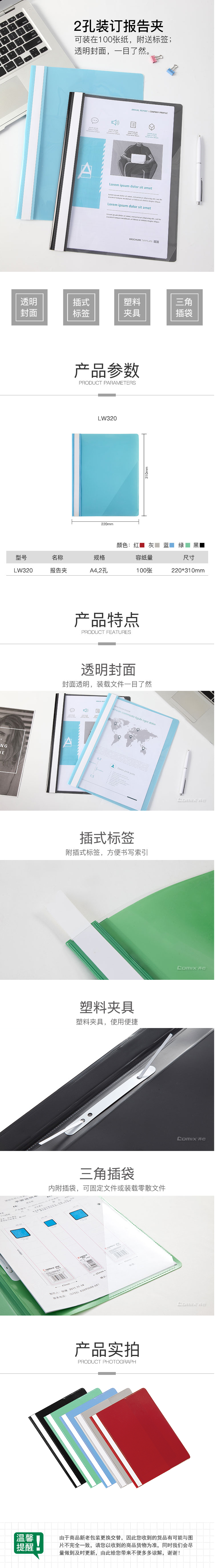 商品名称:齐心 LW320 办公必备大容量报告夹 A4 2孔装订式 100张