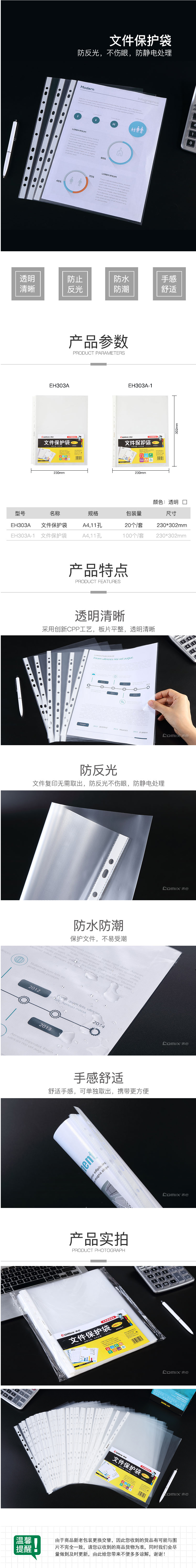 商品名称:齐心 EH303A A4文件保护袋 11孔0.06mm 20个/套