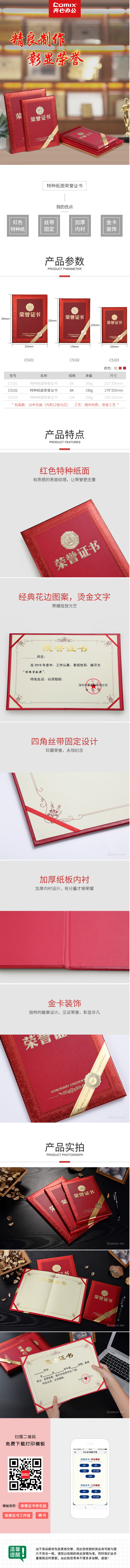 > 齐心 C5102 特种纸荣誉证书8K