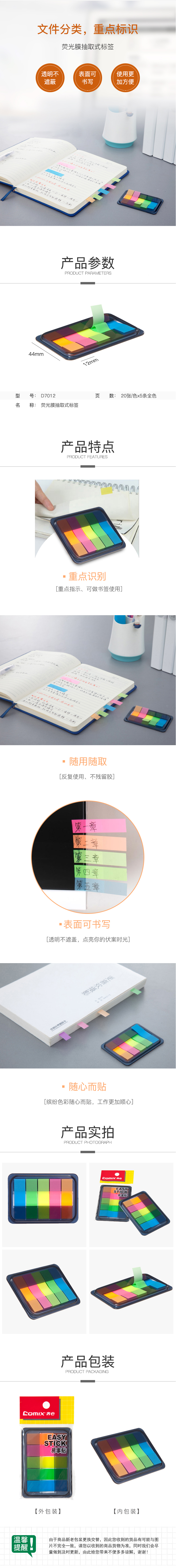 商品名称:齐心 D7012 荧光膜抽取式标签 44*12mm 5条全色告示贴
