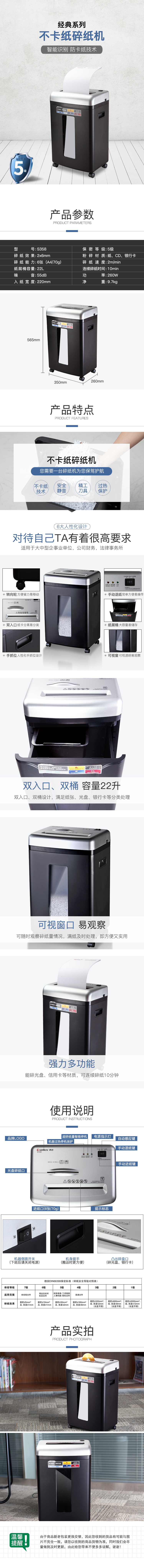 商品名称:齐心 S358 防卡纸多功能碎纸机 2×6mm/6张纸/22L/双入口/续航10分钟